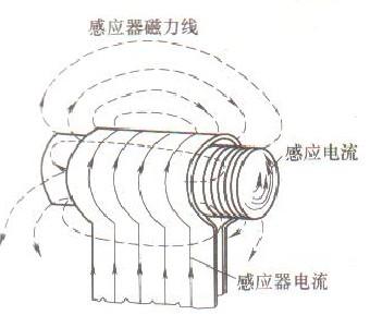感應(yīng)器是一個工作線圈,在交變電流通過線圈時,其導(dǎo)線周圍便產(chǎn)生交變磁場。處在磁場內(nèi)的金屬工件,因電磁感應(yīng)產(chǎn)生了電動勢。當金屬工件具有完整的電路時,就有渦流產(chǎn)生。此渦流與線圈電流相平行,方向相反,如圖7-1所示。渦流 :使工件加熱,線圈此時有機械力作用在工 ,件上。從電路上講,感應(yīng)器由串聯(lián)的電阻和電感組成,它必須與電源相匹配。表面淬火用感應(yīng)器根據(jù)工件要求,能表回淬火用感應(yīng)器根據(jù)工件要求,能過試驗與生產(chǎn)實踐,現(xiàn)在已有一些具體的設(shè)計原則,但仍以經(jīng)驗設(shè)計為主。計算機模擬已在一 些現(xiàn)代化感應(yīng)加熱設(shè)備制造廠開始應(yīng)用。